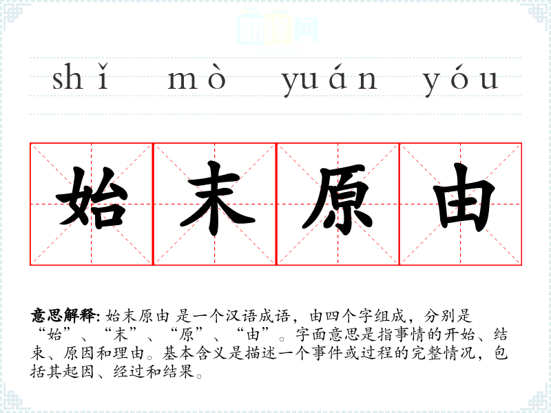 始末原由 是一个汉语成语,由四个字组成,分别是“始”、“末”、“原”、“由”。字面意思是指事情的开始、结束、原因和理由。基本含义是描述一个**或过程的完整情况,包括其起因、经过和结果。
