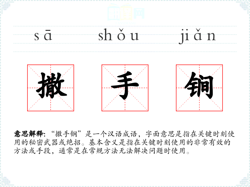 “撒手锏”是一个汉语成语,字面意思是指在关键时刻使用的秘密武器或绝招。基本含义是指在关键时刻使用的非常有效的方法或手段,通常是在常规方法无法解决问题时使用。