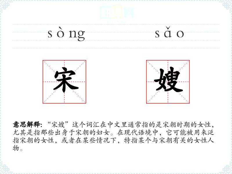 - 同义词:宋妇、宋女(这些词汇在特定语境下可以互换使用,但“宋嫂”更具有特定的文化和社会含义)