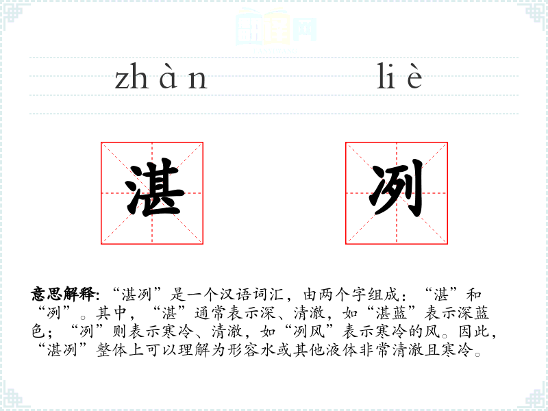 “湛冽”的词源较为古典,源自古代汉语,其中“湛”字在《说文解字》中解释为“深也”,而“冽”字则有“寒冷”之意。在古代文学作品中,这两个字常被用来形容自然景观,随着时间的推移,这种用法逐渐固定下来。
