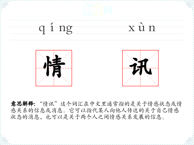 “情讯”由“情”和“讯”两个字组成。“情”指情感或情绪,“讯”指消息或信息。这个词在古代文学中已有使用,但随着社会的发展,其使用场景和含义也在不断演变和丰富。