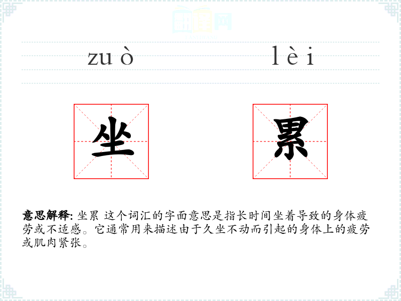 “坐累”这个词由“坐”和“累”两个字组成。在汉语中,“坐”指的是一种姿势,而“累”则表示疲劳或疲惫。这个词的组合反映了长时间保持同一姿势导致的疲劳感。