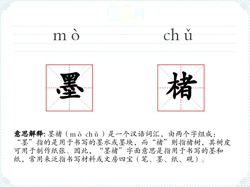 “墨”字最早见于甲骨文,原意为黑色的颜料,用于书写和绘画。“楮”字则源于楮树,古代常用其树皮制作纸张。随着时间的推移,“墨楮”逐渐成为代表书写文化的词汇。