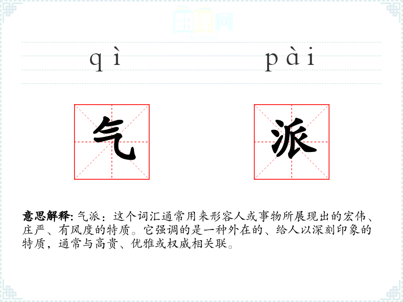 气派:这个词汇通常用来形容人或事物所展现出的宏伟、庄严、有风度的特质。它强调的是一种外在的、给人以深刻印象的特质,通常与高贵、优雅或权威相关联。