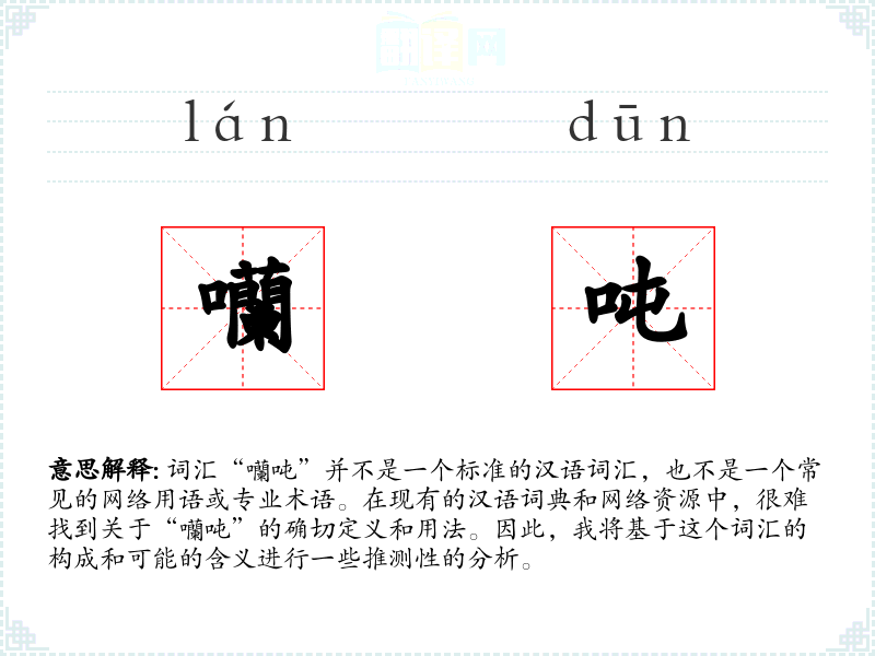 词汇“囒吨”并不是一个标准的汉语词汇,也不是一个常见的网络用语或专业术语。在现有的汉语词典和网络资源中,很难找到关于“囒吨”的确切定义和用法。因此,我将基于这个词汇的构成和可能的含义进行一些推测性的分析。