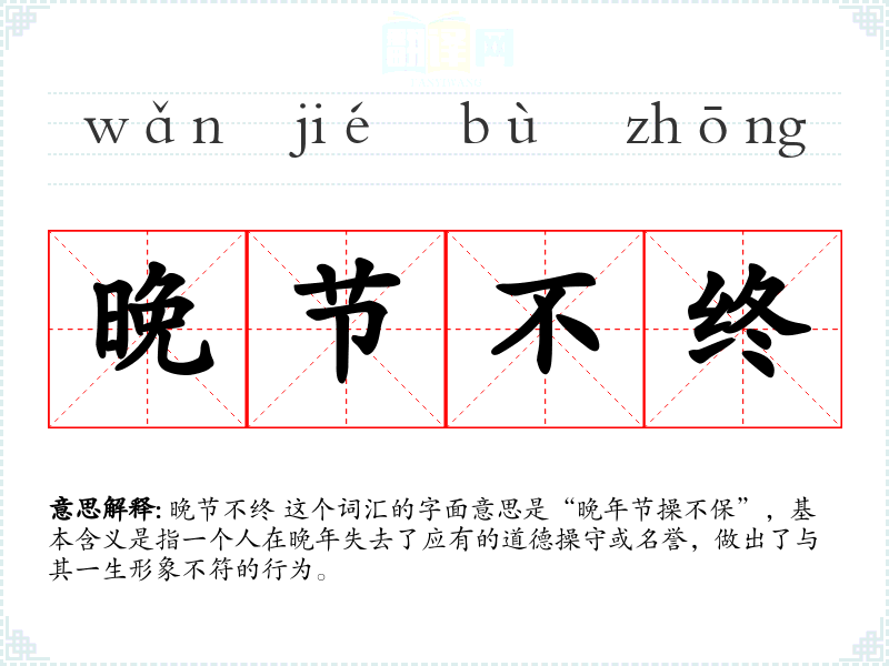 晚节不终 这个词汇的字面意思是“晚年节操不保”,基本含义是指一个人在晚年失去了应有的道德操守或名誉,做出了与其一生形象不符的行为。