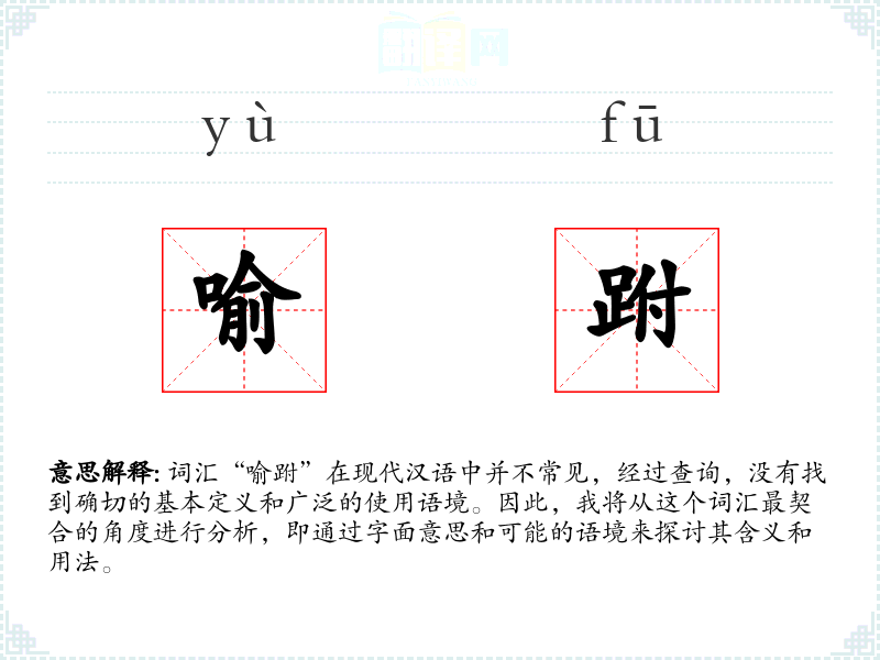 对于“喻跗”这个词汇,由于其不常见和定义不明确,理解和应用可能存在一定的困难。在语言学习和表达中,了解和掌握常用词汇更为重要。对于不常见的词汇,可以通过字面意思和可能的语境来尝试理解其含义,但不必过分纠结于其确切定义。
