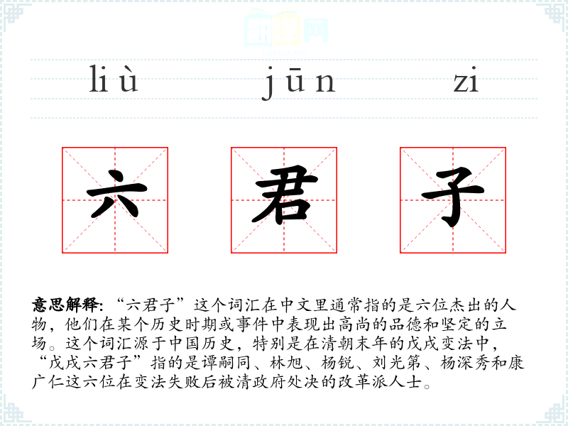 - 反义词:六小人(强调品德低下,与“六君子”形成鲜明对比)