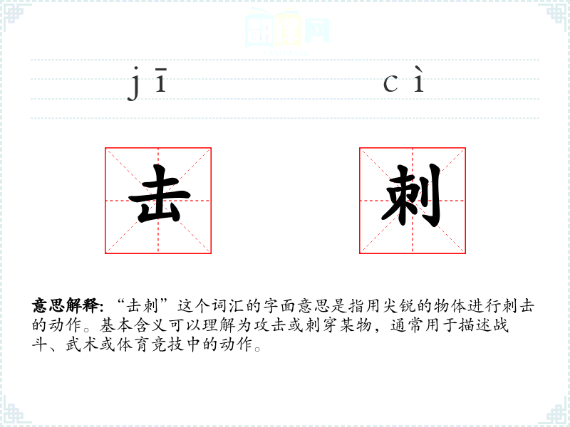 在武术文化中,“击刺”是一个重要的概念,它不仅描述了具体的动作,还代表了武术中的攻击技巧和战术。在社会背景中,这个词汇可能被用来比喻性地描述激烈的争论或批评,反映了社会中的竞争和冲突。