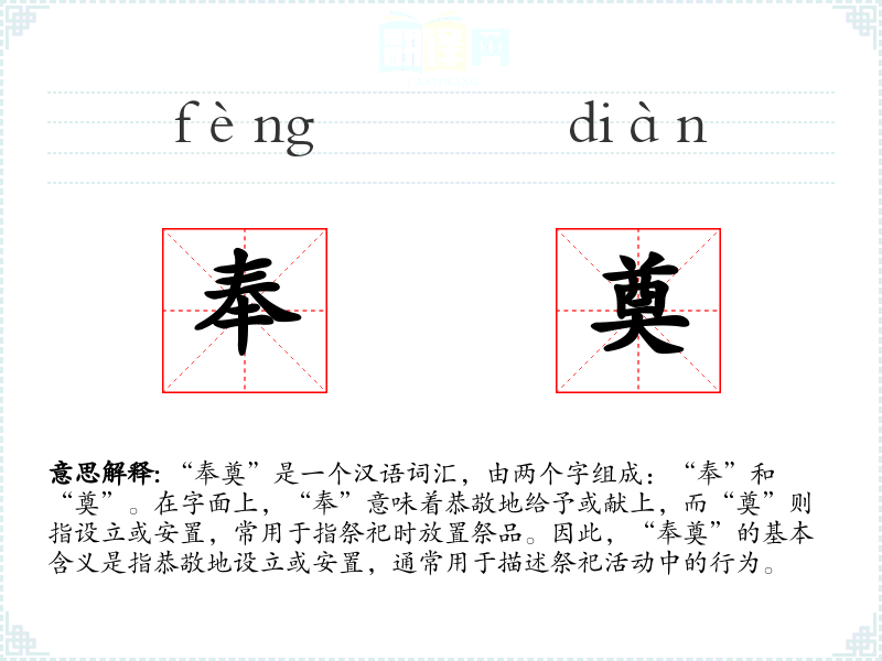 - 反义词:无(由于“奉奠”特定用于祭祀行为,较少有直接的反义词)