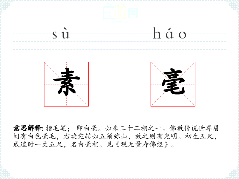 指毛笔; 即白毫。如来三十二相之一。佛教传说世尊眉间有白色毫毛,右旋宛转如五须弥山,放之则有光明。初生五尺,成道时一丈五尺,名白毫相。见《观无量寿佛经》。