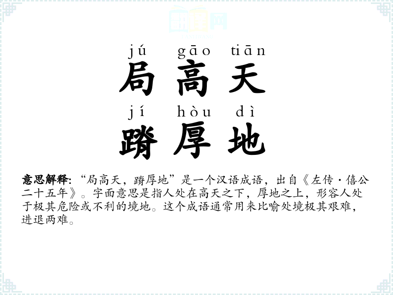 “局高天,蹐厚地”是一个汉语成语,出自《左传·僖公二十五年》。字面意思是指人处在高天之下,厚地之上,形容人处于极其危险或不利的境地。这个成语通常用来比喻处境极其艰难,进退两难。
