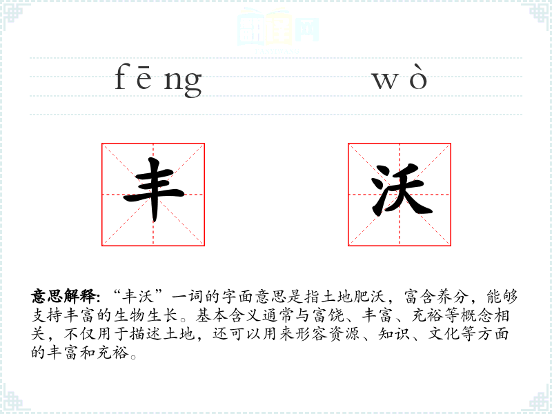 - 文学:在文学作品中,“丰沃”常用来形容自然景观的美丽和富饶,如“丰沃的田野”、“丰沃的草原”。