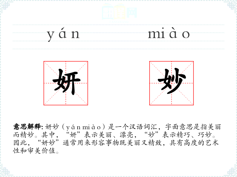 妍妙(yán miào)是一个汉语词汇,字面意思是指美丽而精妙。其中,“妍”表示美丽、漂亮,“妙”表示精巧、巧妙。因此,“妍妙”通常用来形容事物既美丽又精致,具有高度的艺术性和审美价值。