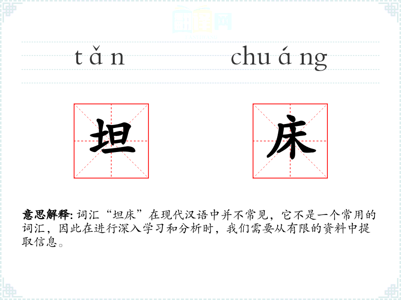 “坦”字在古代汉语中意为平坦,而“床”在古代有时指地面或平台。因此,“坦床”可能是由这两个字组合而成的词汇,用来描述平坦的地面或阵地。