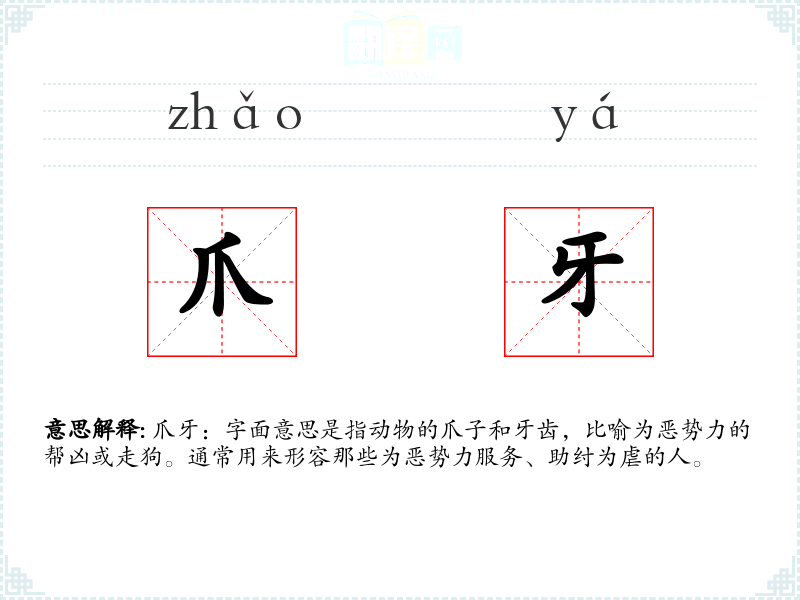 爪牙:字面意思是指动物的爪子和牙齿,比喻为恶势力的帮凶或走狗。通常用来形容那些为恶势力服务、助纣为虐的人。