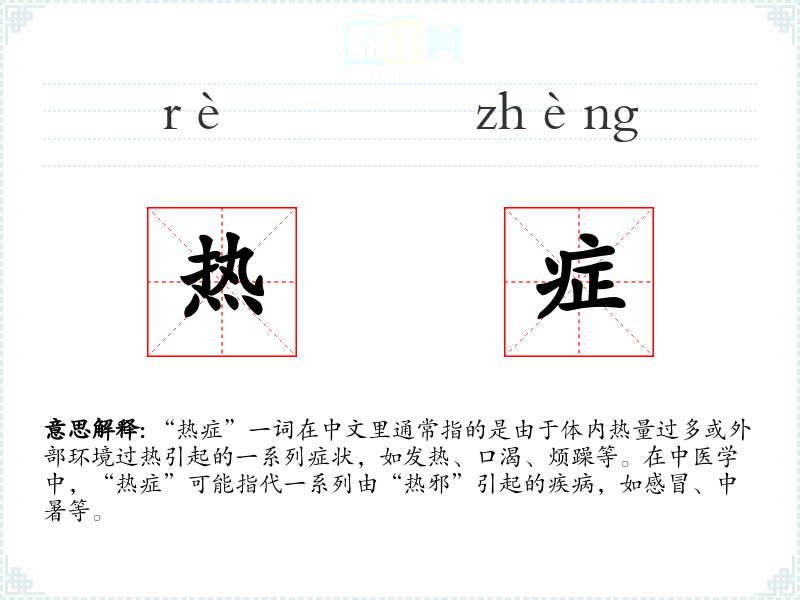 “热症”一词在中文里通常指的是由于体内热量过多或外部环境过热引起的一系列症状,如发热、口渴、烦躁等。在中医学中,“热症”可能指代一系列由“热邪”引起的疾病,如感冒、中暑等。