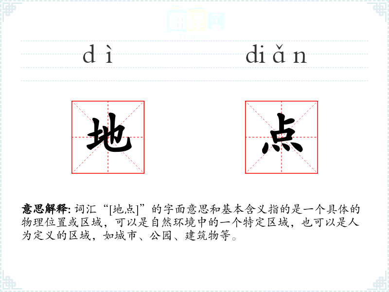 同义词:位置、场所、地域、区域 反义词:无(因为“地点”是一个基础概念,没有直接的反义词)