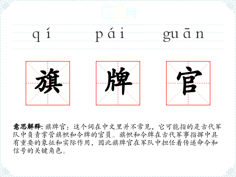 旗牌官:这个词在中文里并不常见,它可能指的是古代军队中负责掌管旗帜和令牌的官员。旗帜和令牌在古代军事指挥中具有重要的象征和实际作用,因此旗牌官在军队中担任着传递命令和信号的关键角色。