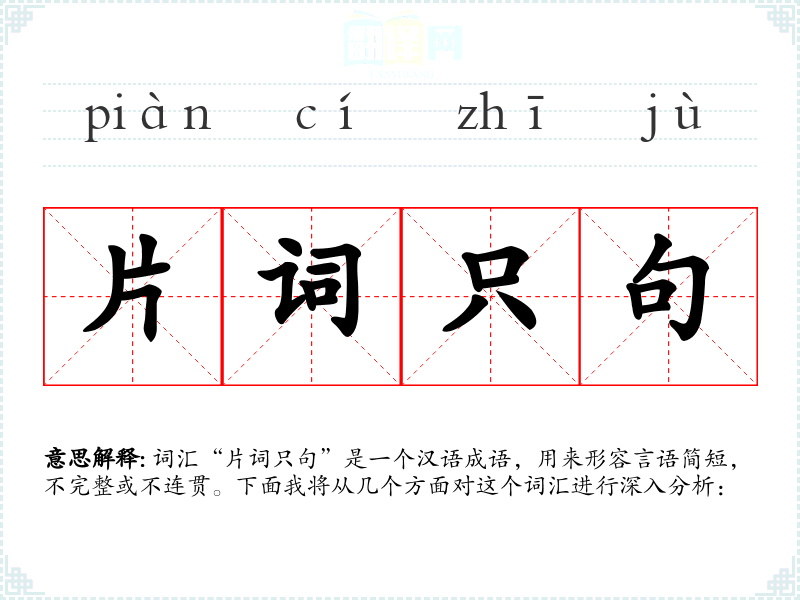 词汇“片词只句”是一个汉语成语,用来形容言语简短,不完整或不连贯。下面我将从几个方面对这个词汇进行深入分析:
