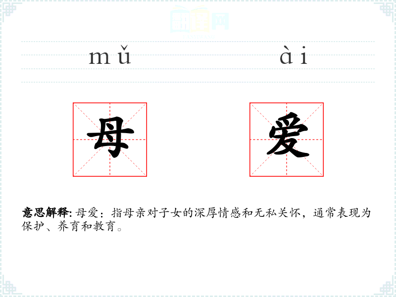 母爱:指母亲对子女的深厚情感和无私关怀,通常表现为保护、养育和教育。