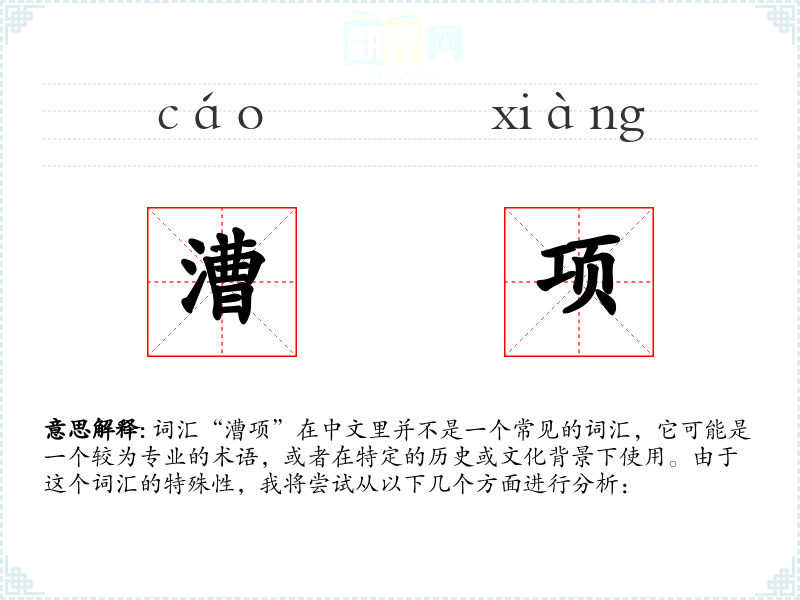 词汇“漕项”在中文里并不是一个常见的词汇,它可能是一个较为专业的术语,或者在特定的历史或文化背景下使用。由于这个词汇的特殊性,我将尝试从以下几个方面进行分析: