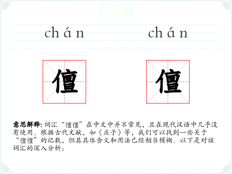 词汇“儃儃”在中文中并不常见,且在现代汉语中几乎没有使用。根据古代文献,如《庄子》等,我们可以找到一些关于“儃儃”的记载,但其具体含义和用法已经相当模糊。以下是对该词汇的深入分析: