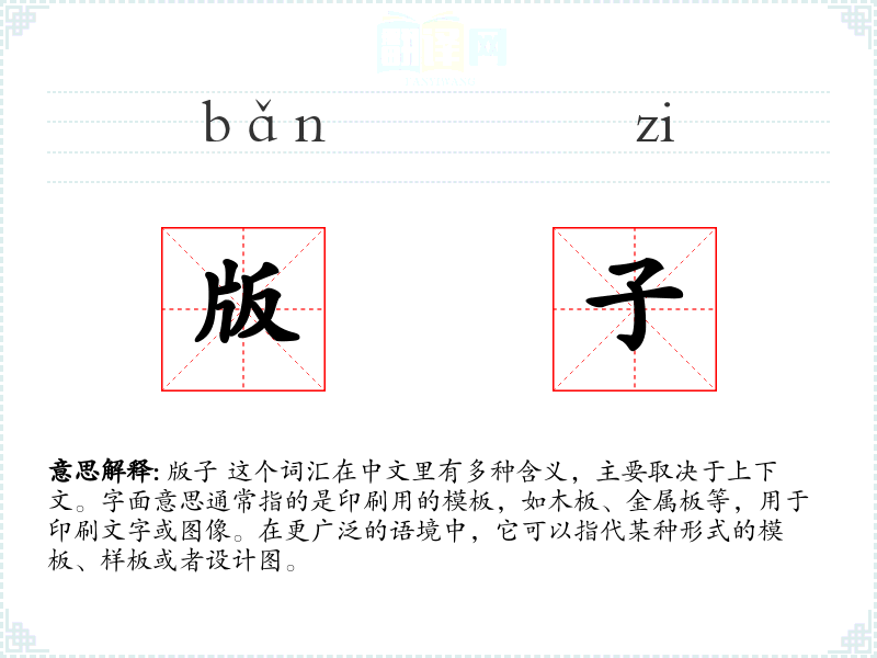 版子 这个词汇在中文里有多种含义,主要取决于上下文。字面意思通常指的是印刷用的模板,如木板、金属板等,用于印刷文字或图像。在更广泛的语境中,它可以指代某种形式的模板、样板或者设计图。