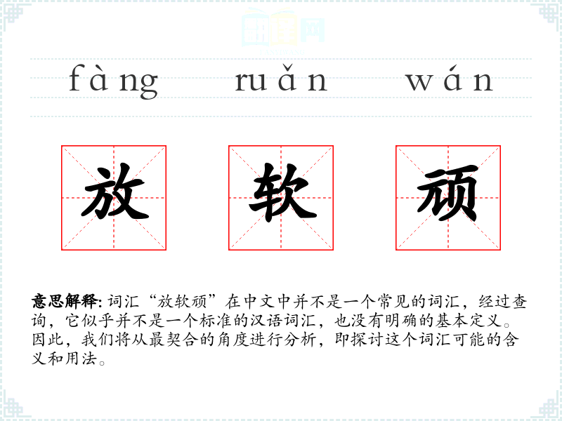 词汇“放软顽”在中文中并不是一个常见的词汇,经过查询,它似乎并不是一个标准的汉语词汇,也没有明确的基本定义。因此,我们将从最契合的角度进行分析,即探讨这个词汇可能的含义和用法。