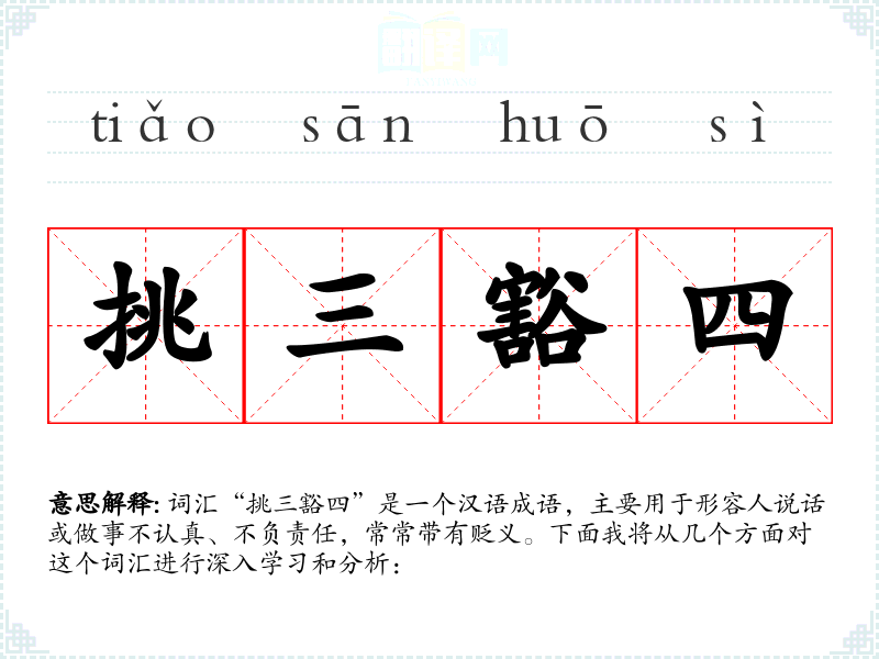 词汇“挑三豁四”是一个汉语成语,主要用于形容人说话或做事不认真、不负责任,常常带有贬义。下面我将从几个方面对这个词汇进行深入学*和分析: