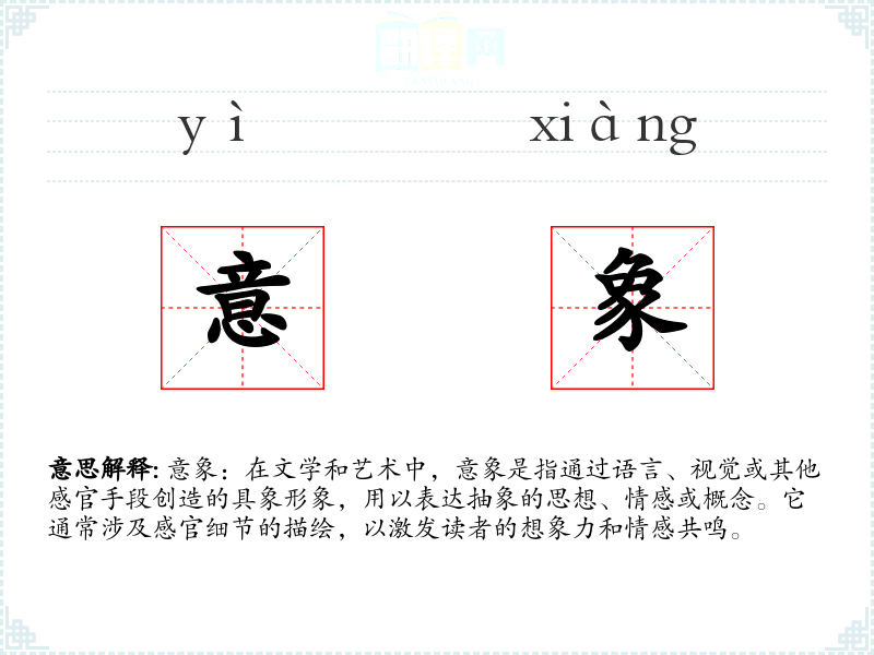 意象:在文学和艺术中,意象是指通过语言、视觉或其他感官手段创造的具象形象,用以表达抽象的思想、情感或概念。它通常涉及感官细节的描绘,以激发读者的想象力和情感共鸣。
