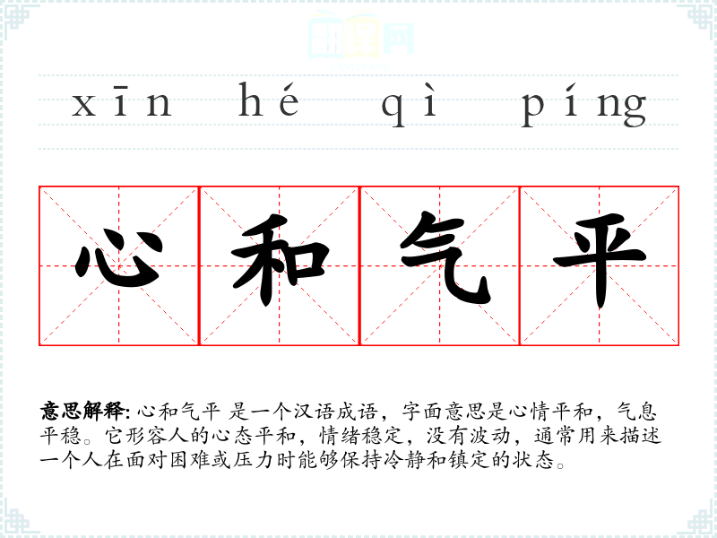 心和气平 是一个汉语成语,字面意思是心情平和,气息平稳。它形容人的心态平和,情绪稳定,没有波动,通常用来描述一个人在面对困难或压力时能够保持冷静和镇定的状态。