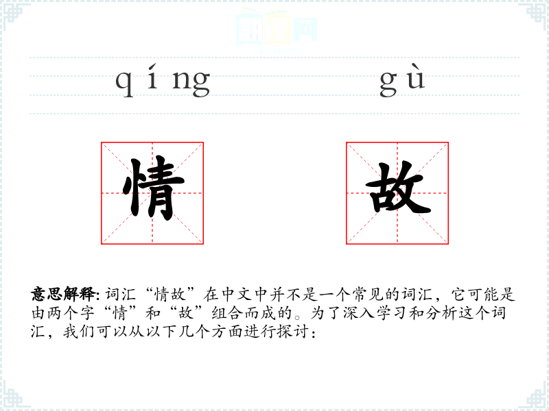词汇“情故”在中文中并不是一个常见的词汇,它可能是由两个字“情”和“故”组合而成的。为了深入学*和分析这个词汇,我们可以从以下几个方面进行探讨: