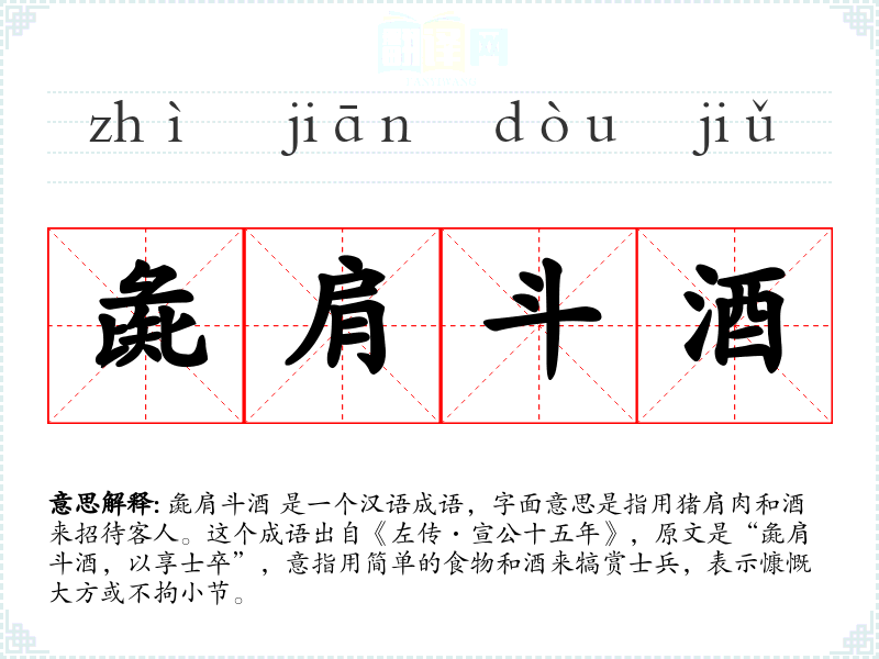 彘肩斗酒 是一个汉语成语,字面意思是指用猪肩肉和酒来招待客人。这个成语出自《左传·宣公十五年》,原文是“彘肩斗酒,以享士卒”,意指用简单的食物和酒来犒赏士兵,表示慷慨大方或不拘小节。