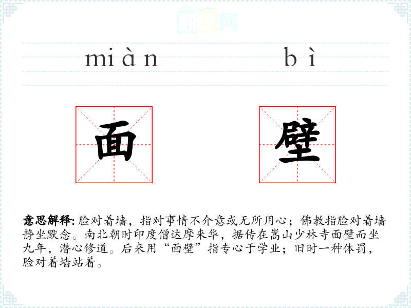 ;佛教指脸对着墙静坐默念。南北朝时印度僧达摩来华,据传在嵩山少林寺面壁而坐九年,潜心修道。后来用“面壁”指专心于学业;旧时一种体罚,脸对着墙站着。