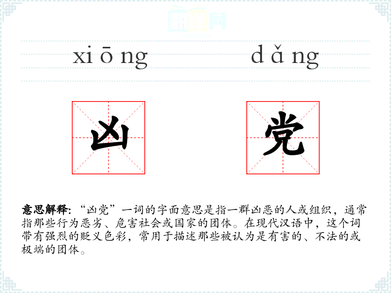 “凶党”一词的字面意思是指一群凶恶的人或组织,通常指那些行为恶劣、危害社会或国家的团体。在现代汉语中,这个词带有强烈的贬义色彩,常用于描述那些被认为是有害的、不法的或极端的团体。