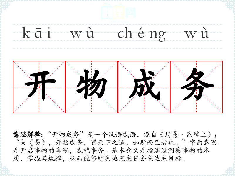 “开物成务”是一个汉语成语,源自《周易·系辞上》:“夫《易》,开物成务,冒天下之道,如斯而已者也。”字面意思是开启事物的奥秘,成就事务。基本含义是指通过洞察事物的本质,掌握其规律,从而能够顺利地完成任务或达成目标。