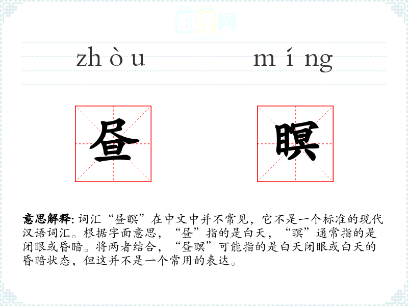 词汇“昼瞑”在中文中并不常见,它不是一个标准的现代汉语词汇。根据字面意思,“昼”指的是白天,“瞑”通常指的是闭眼或昏暗。将两者结合,“昼瞑”可能指的是白天闭眼或白天的昏暗状态,但这并不是一个常用的表达。
