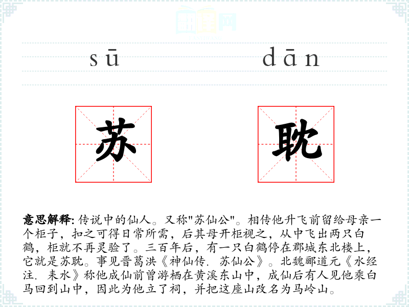 1.传说中的仙人。又称"苏仙公"。相传他升飞前留给母亲一个柜子,扣之可得日常所需,后其母开柜视之,从中飞出两只白鹤,柜就不再灵验了。三百年后,有一只白鹤停在郡城东北楼上,它就是苏耽。事见晋葛洪《神仙传.苏仙公》。北魏郦道元《水经注.耒水》称他成仙前曾游栖在黄溪东山中,成仙后有人见他乘白马回到山中,因此为他立了祠,并把这座山改名为马岭山。