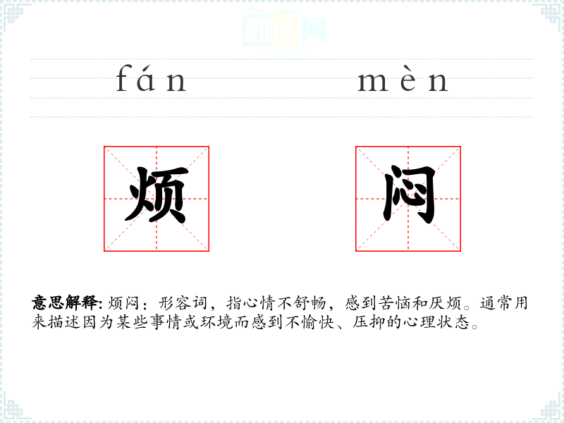 烦闷:形容词,指心情不舒畅,感到苦恼和厌烦。通常用来描述因为某些事情或环境而感到不愉快、压抑的心理状态。