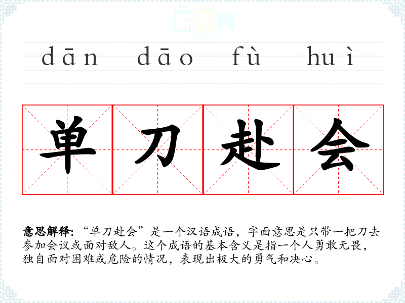“单刀赴会”是一个汉语成语,字面意思是只带一把刀去参加会议或面对敌人。这个成语的基本含义是指一个人勇敢无畏,独自面对困难或危险的情况,表现出极大的勇气和决心。