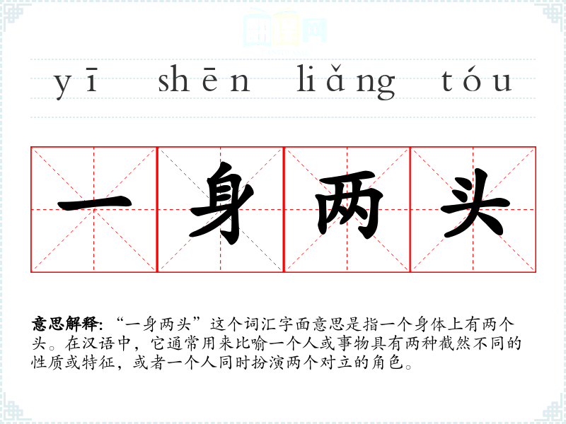 “一身两头”这个词汇字面意思是指一个身体上有两个头。在汉语中,它通常用来比喻一个人或事物具有两种截然不同的性质或特征,或者一个人同时扮演两个对立的角色。