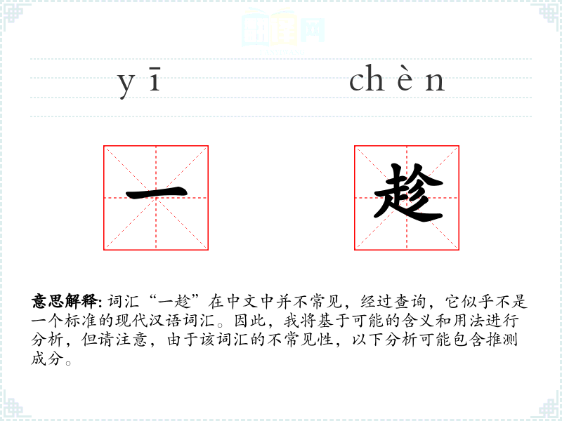 词汇“一趁”在中文中并不常见,经过查询,它似乎不是一个标准的现代汉语词汇。因此,我将基于可能的含义和用法进行分析,但请注意,由于该词汇的不常见性,以下分析可能包含推测成分。
