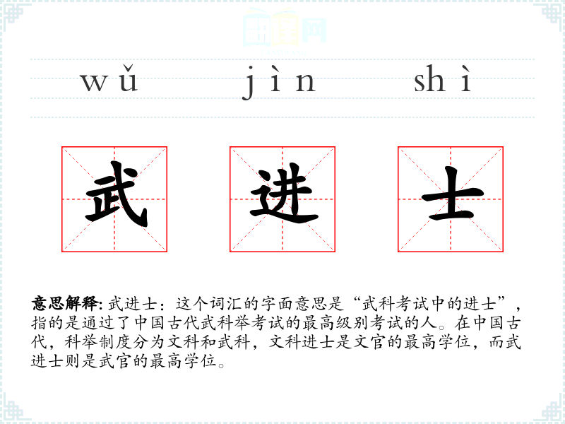 武进士:这个词汇的字面意思是“武科考试中的进士”,指的是通过了古代武科举考试的最高级别考试的人。在古代,科举制度分为文科和武科,文科进士是文官的最高学位,而武进士则是武官的最高学位。