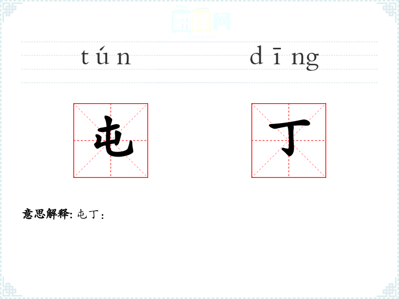 - 词源:屯丁一词源于古代汉语,“屯”指驻扎、聚集,“丁”指成年男子或士兵。