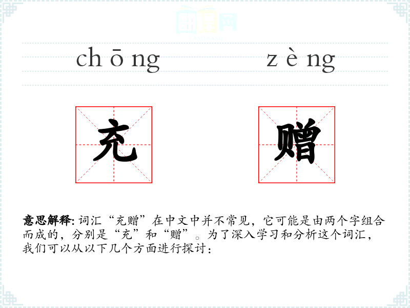 结合这两个字,“充赠”可能指的是充满并赠送某物,或者是在赠送的同时使其充实。