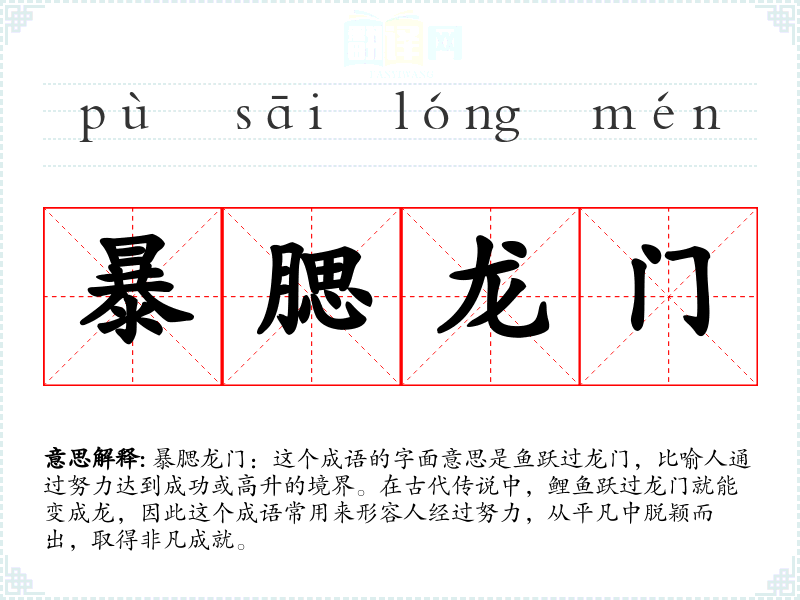 暴腮龙门:这个成语的字面意思是鱼跃过龙门,比喻人通过努力达到成功或高升的境界。在古代传说中,鲤鱼跃过龙门就能变成龙,因此这个成语常用来形容人经过努力,从平凡中脱颖而出,取得非凡成就。