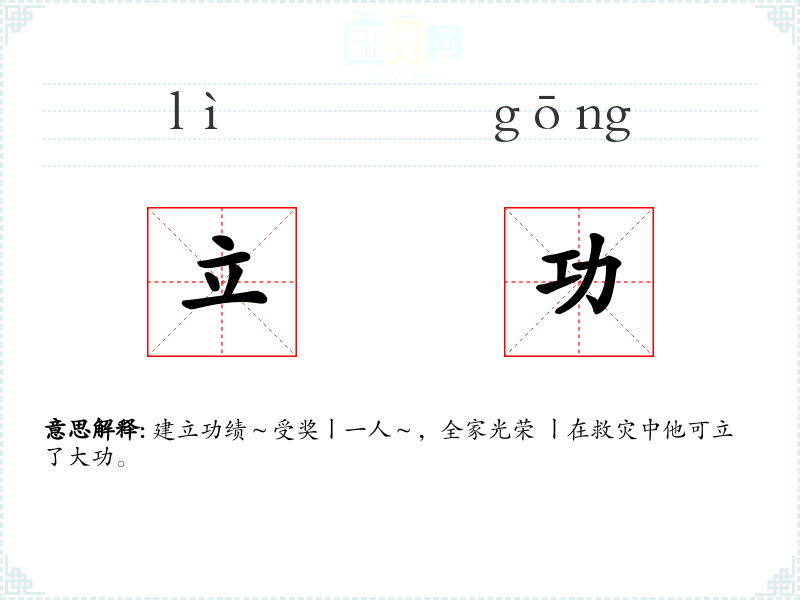 建立功绩~受奖ㄧ一人~,全家光荣 ㄧ在救灾中他可立了大功。