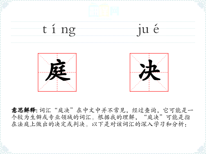 - 理解:“庭决”是一个专业性较强的词汇,主要用于描述法庭上的正式决定或判决。