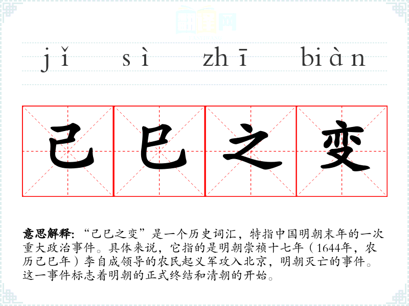 “己巳之变”是一个历史词汇,特指明朝末年的一次重大政治。具体来说,它指的是明朝崇祯十七年(14年,农历己巳年)李自成领导的农民起义军攻入北京,明朝灭亡的。这一**标志着明朝的正式终结和清朝的开始。